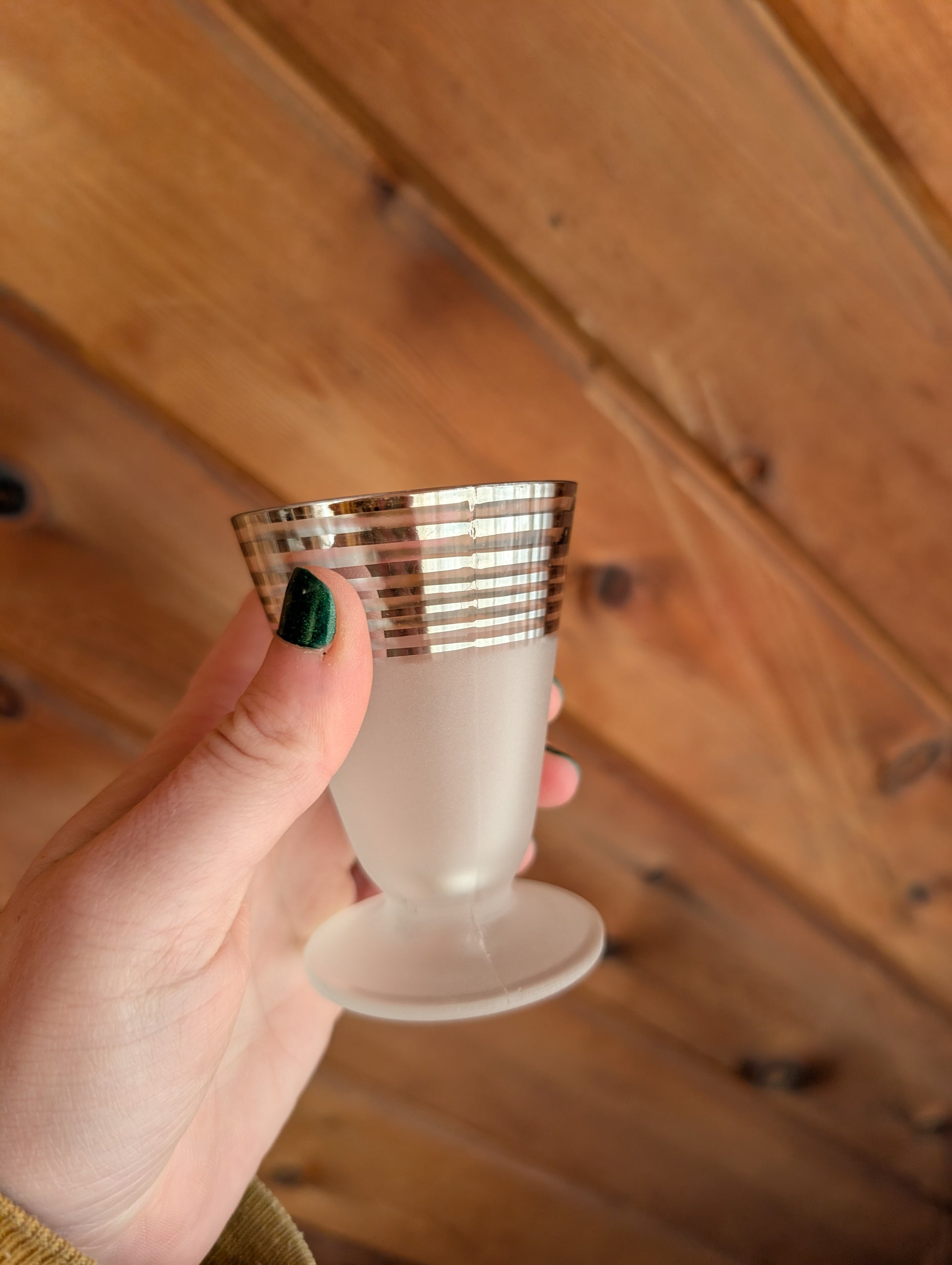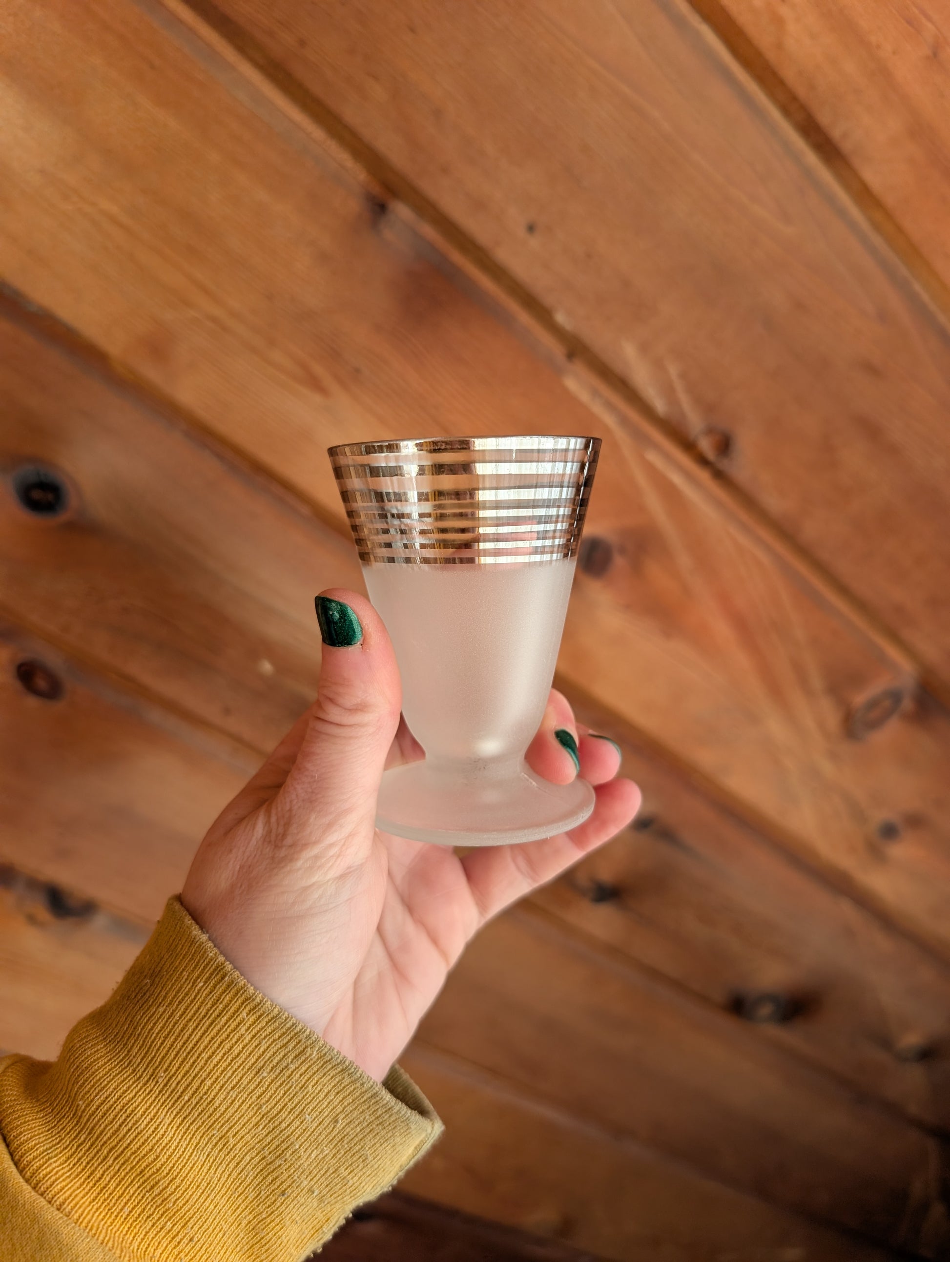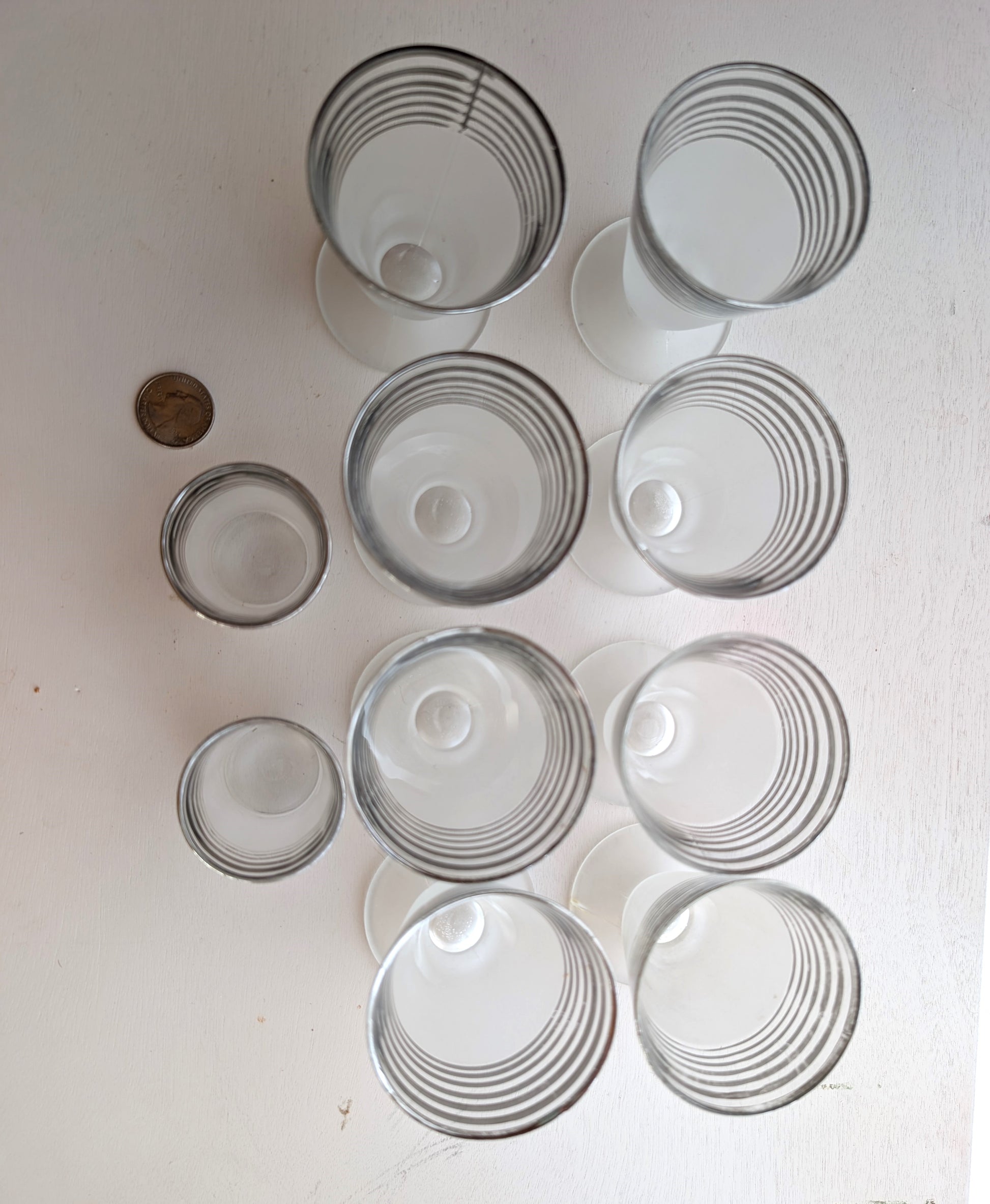 8 Vintage MCM Frosted and Chrome Stripe Cocktail Glasses with Bonus Shot Glasses