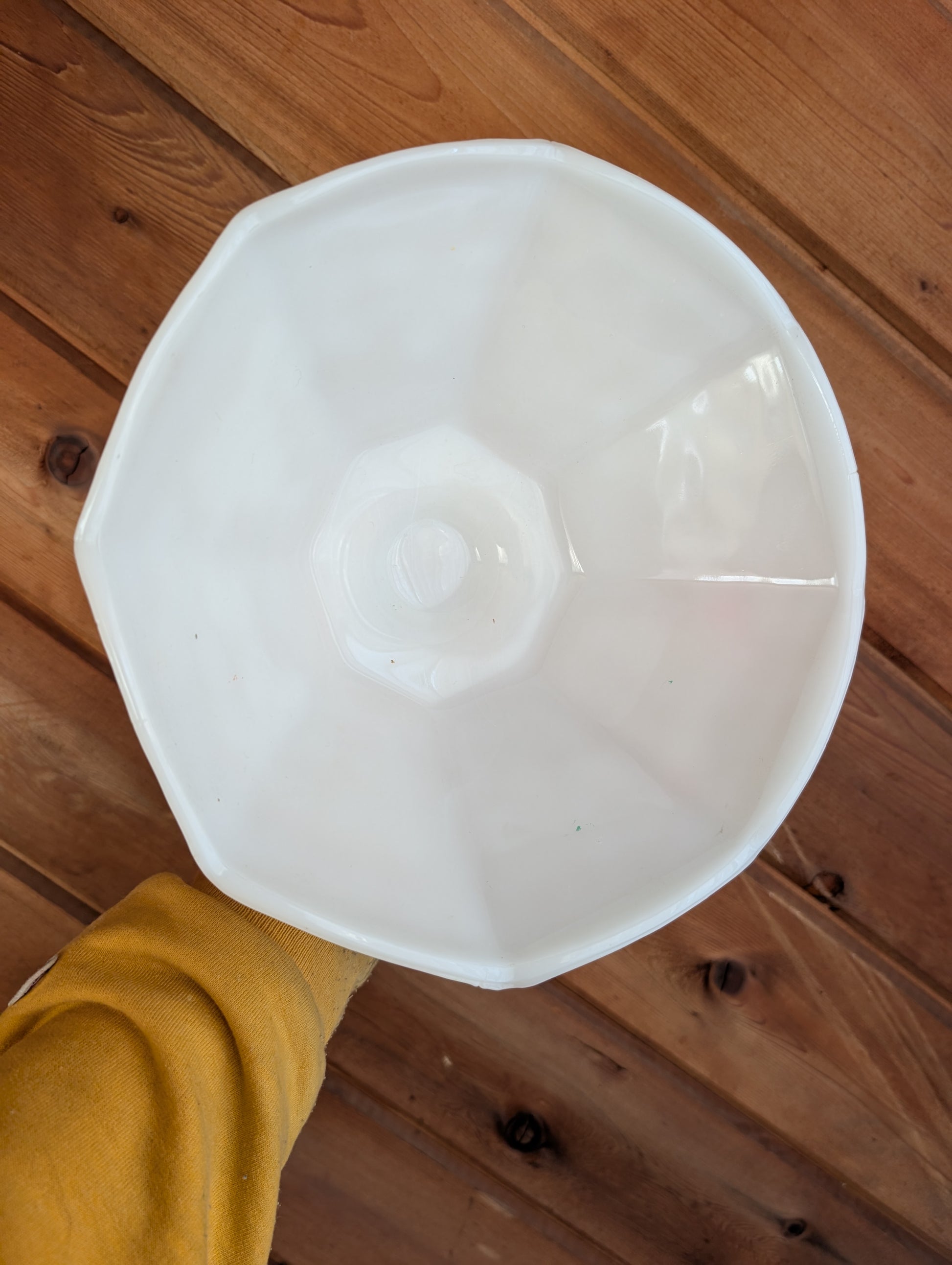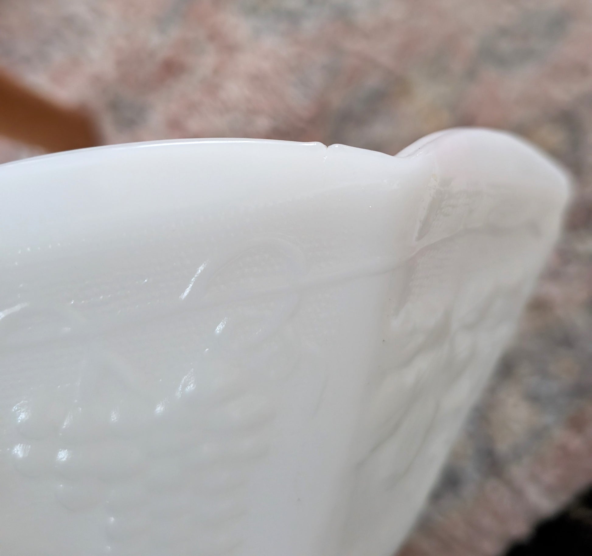 Fantastic vintage Anchor Hocking Milk Glass Grape Themed Pedestal Fruit Bowl. Excellent condition. Only some interesting defects from the manufacturing. See pictures. Grape vines with leaves and grapes surround the fruit bowl