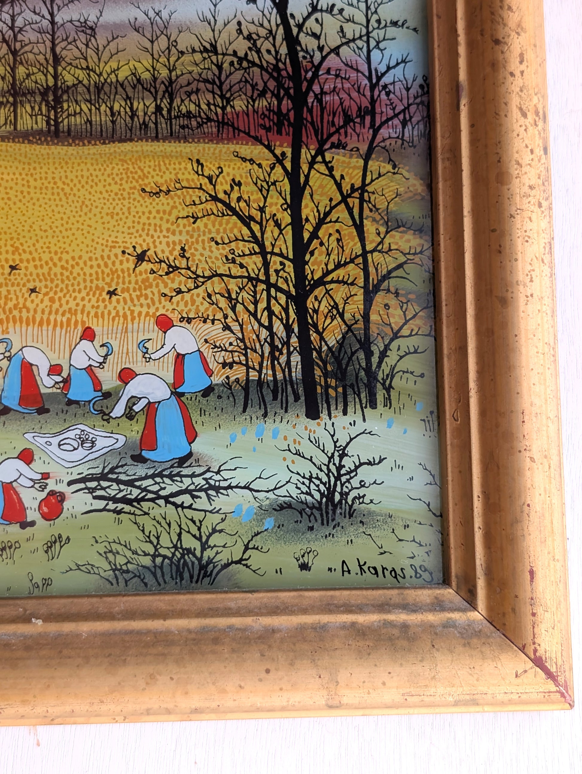 Croatian Naïve Oil on Glass Painting Signed A. Karas 1989 Framed Art