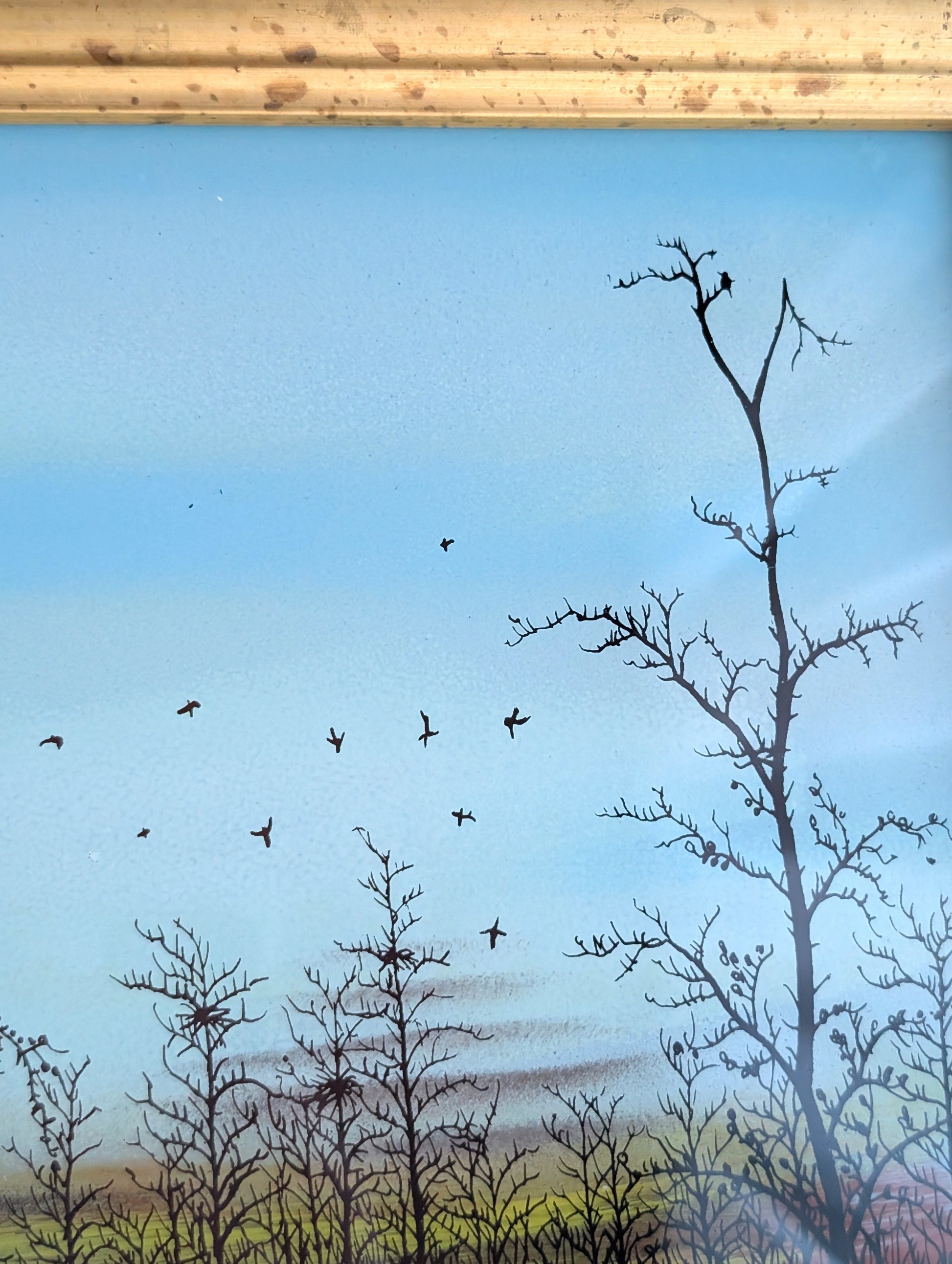 Vibrant Croatian Naïve Oil on Glass Painting Signed A. Karas 1989. I removed the backing of the frame to verify this is an original oil on glass piece. You can see the reverse of the painting in the picture. This piece features country woman harvesting wheat in a field with birds flying overhead. Professionally framed.