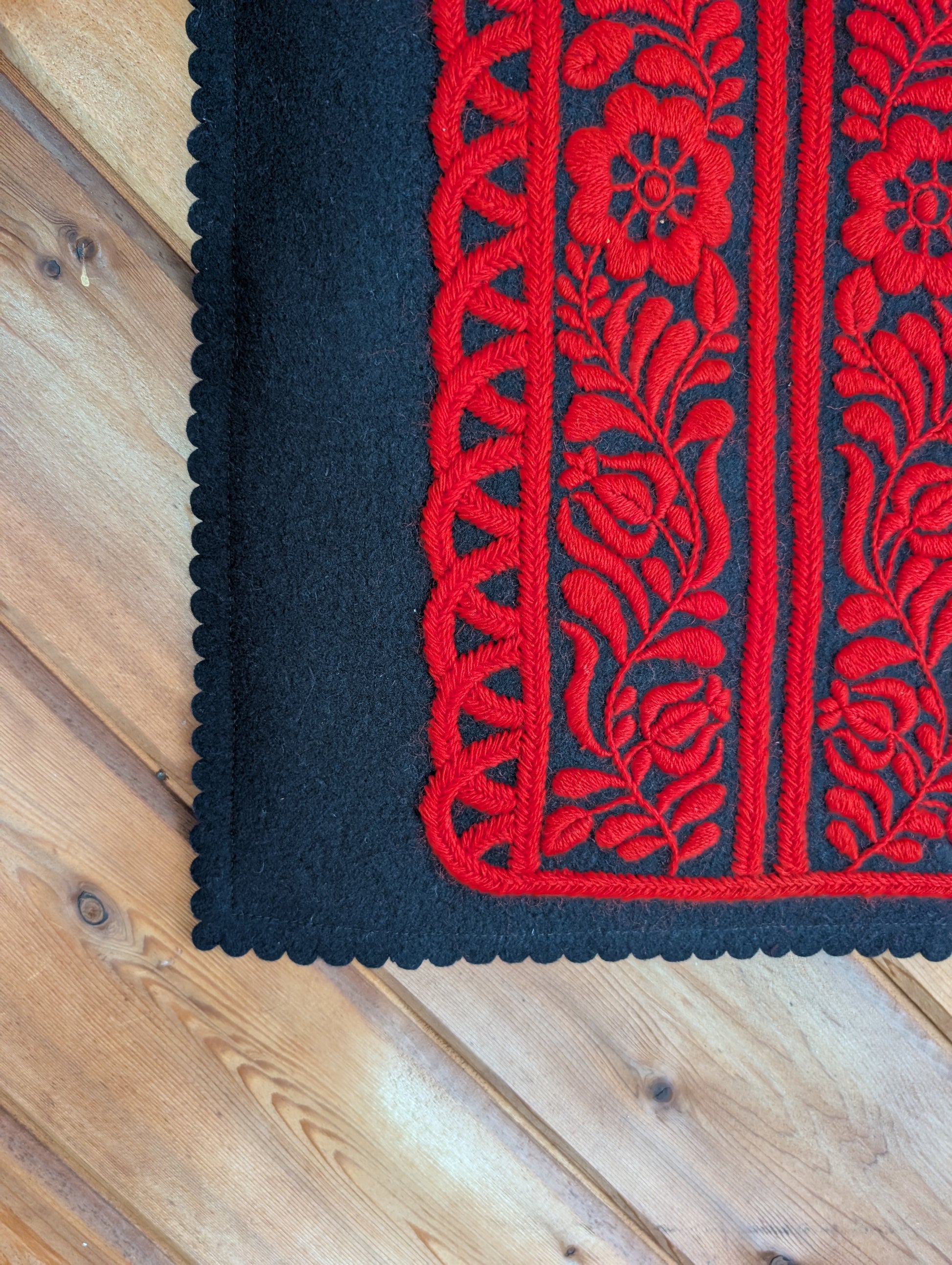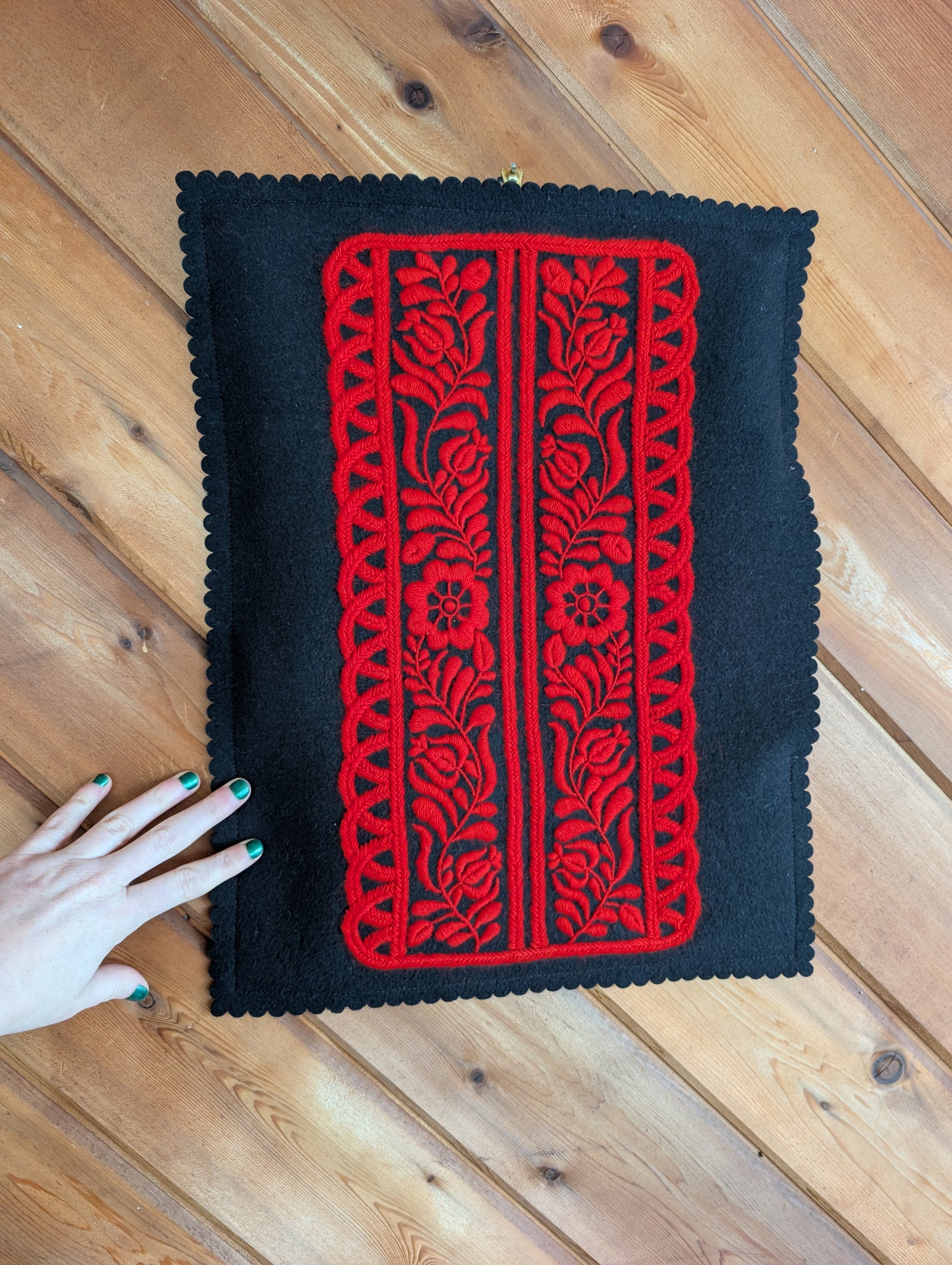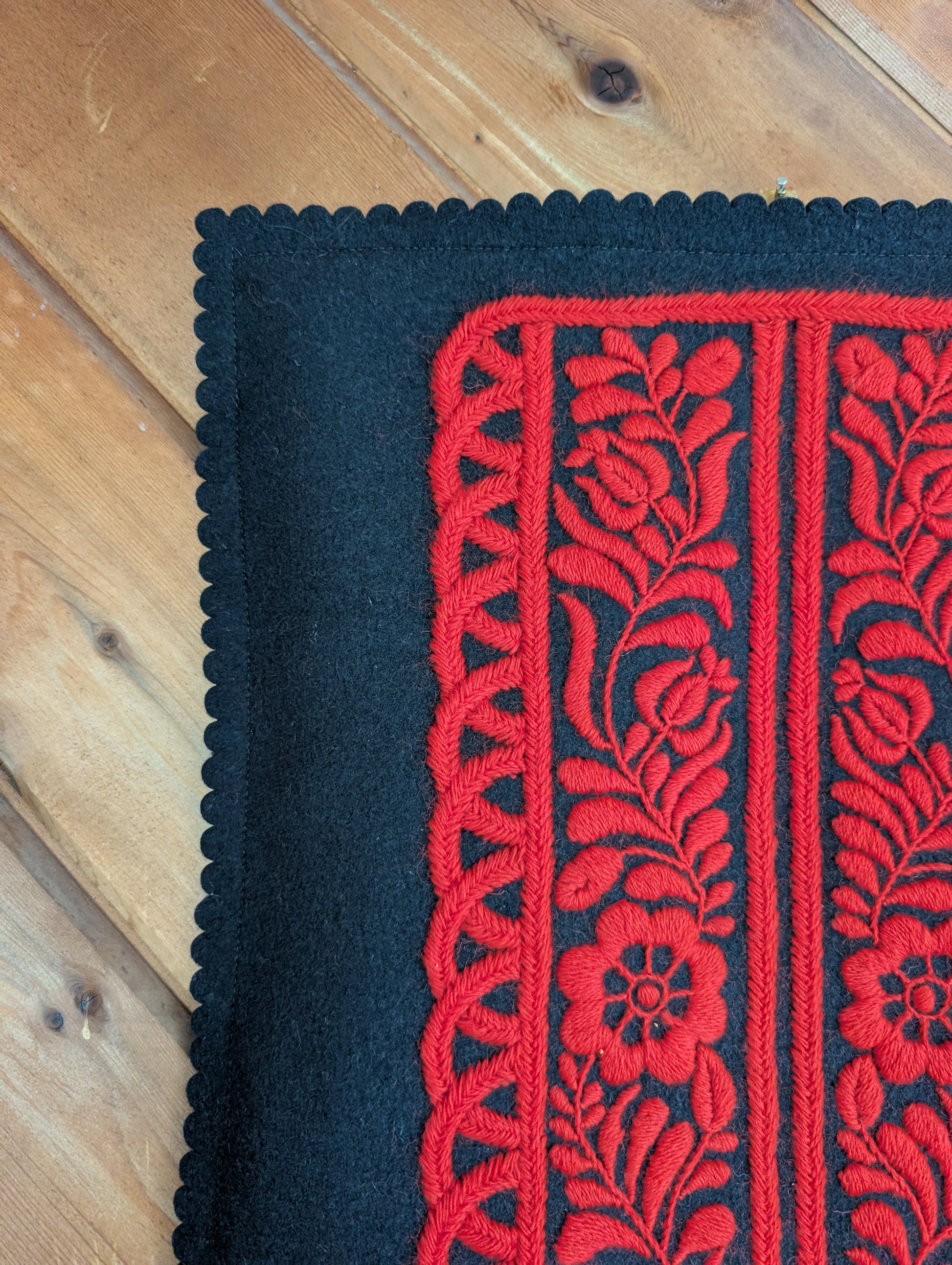 Beautiful Red and Black Hungarian wall tapestry on embroidery on felt. Handmade in a traditional pattern. There is a dowel running through the top. Someone added a safety pin to help hang the item. Please note there is old tape residue on the back.