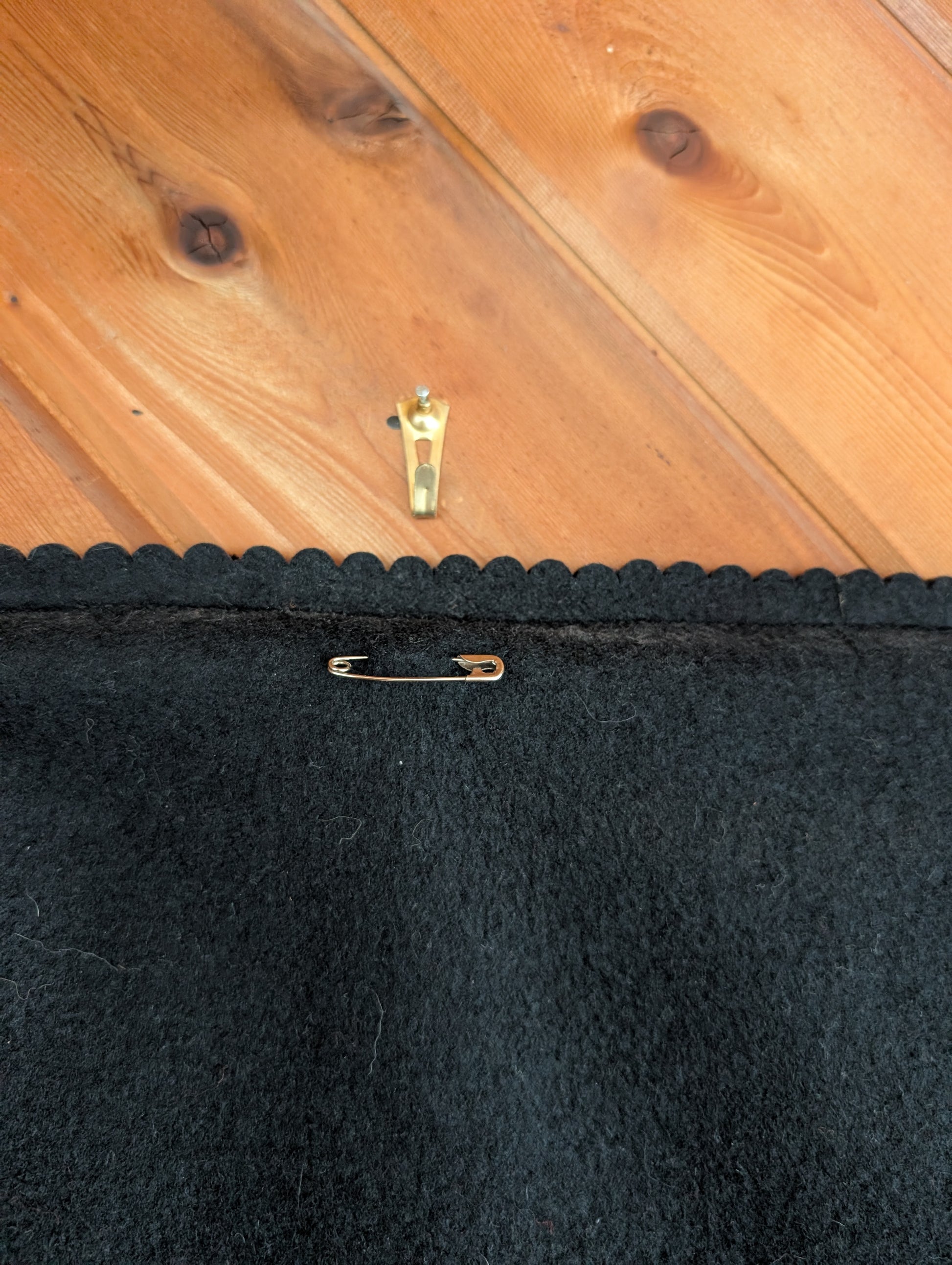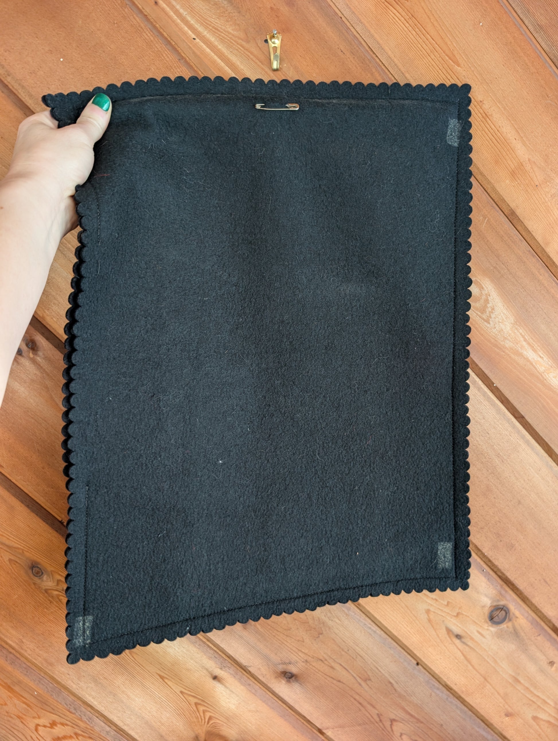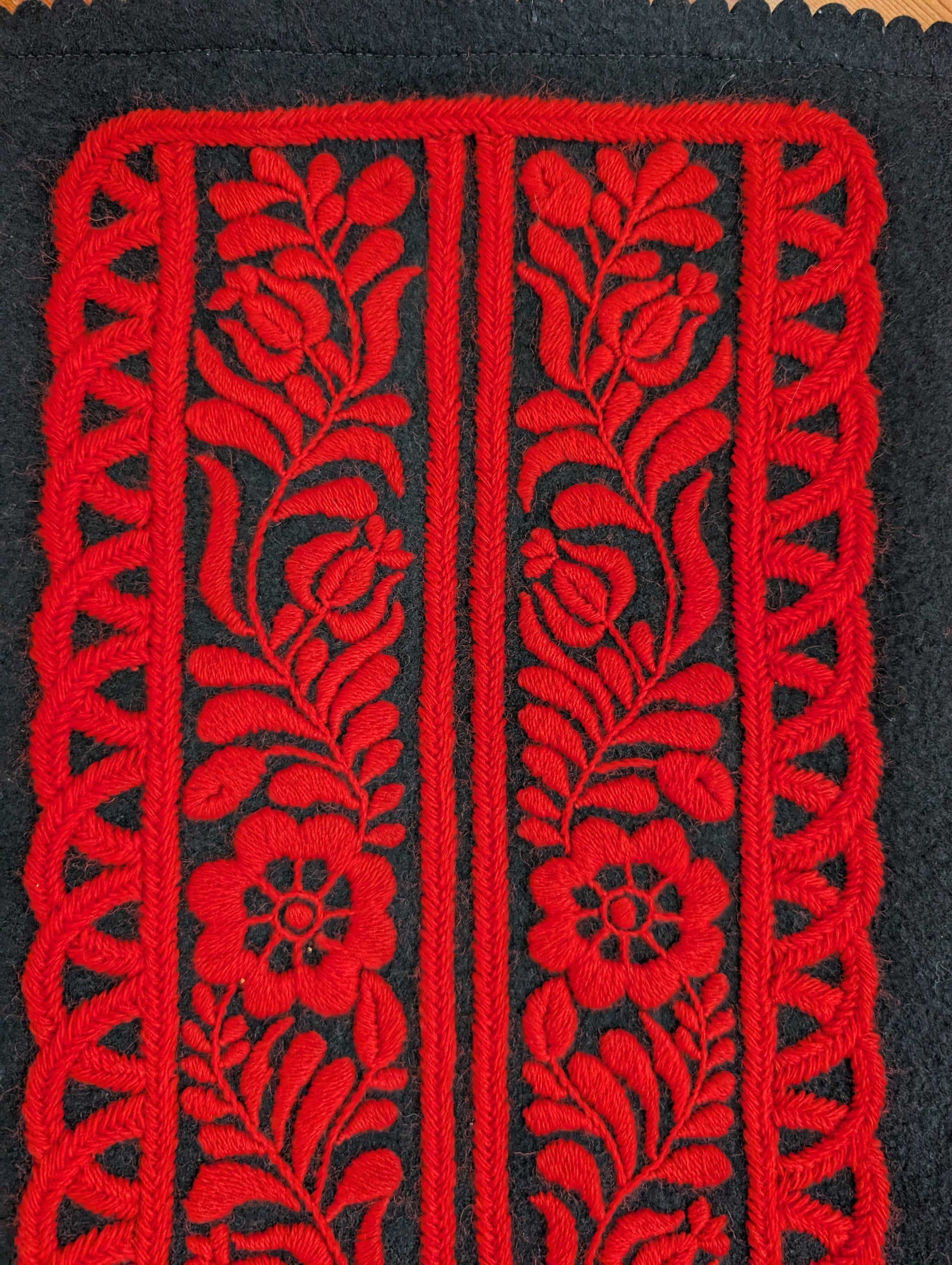 Beautiful Red and Black Hungarian wall tapestry on embroidery on felt. Handmade in a traditional pattern. There is a dowel running through the top. Someone added a safety pin to help hang the item. Please note there is old tape residue on the back.