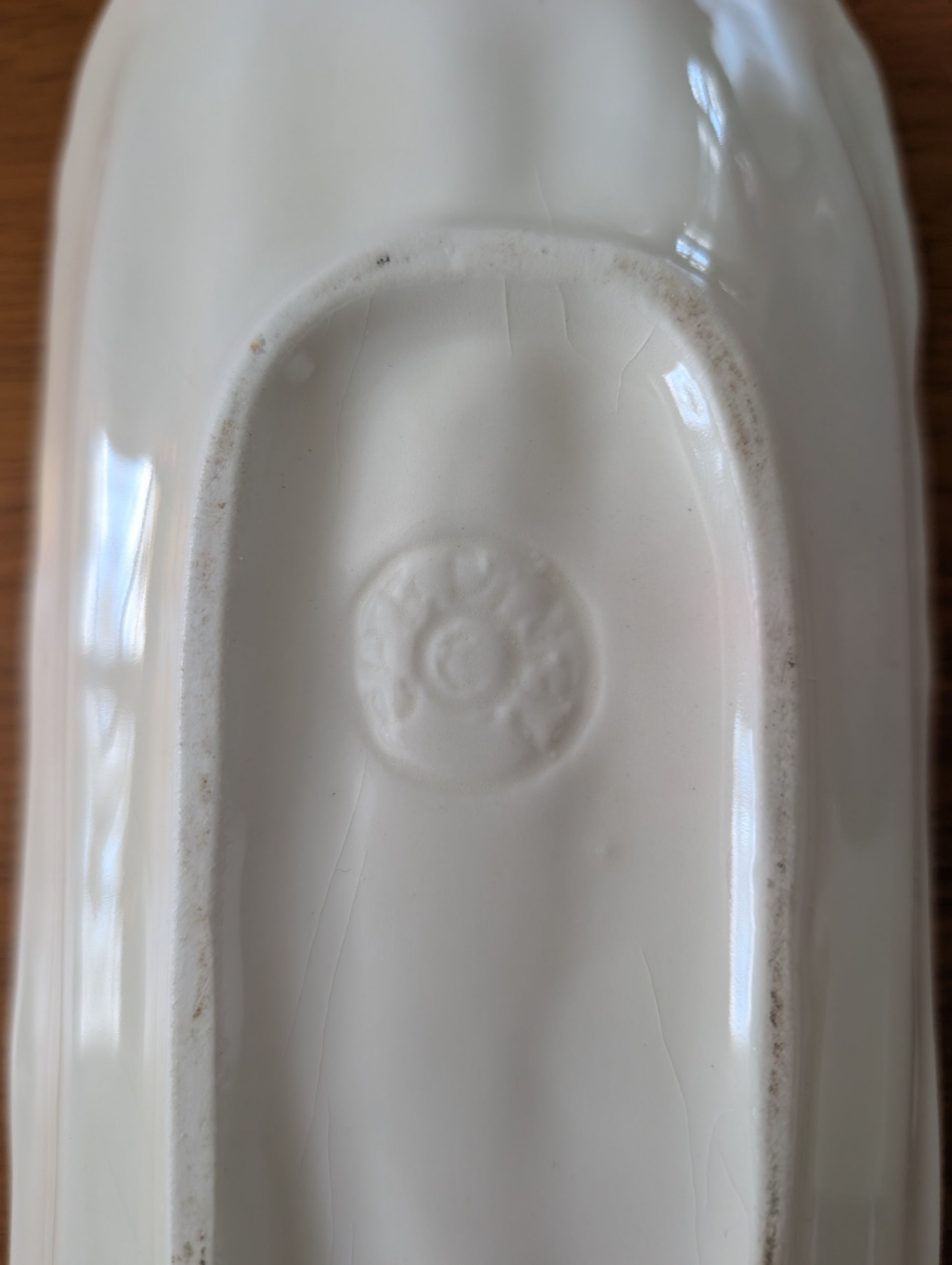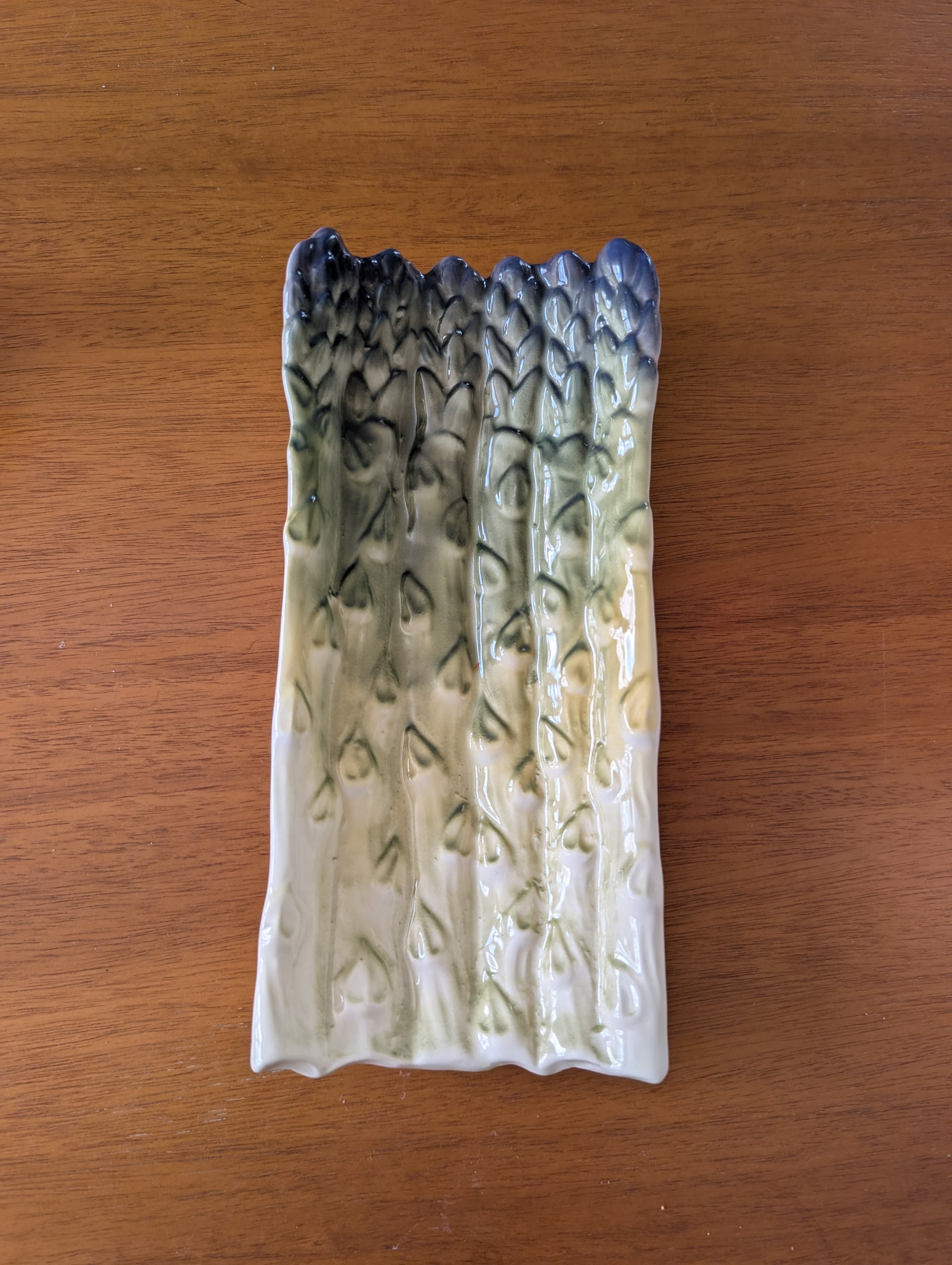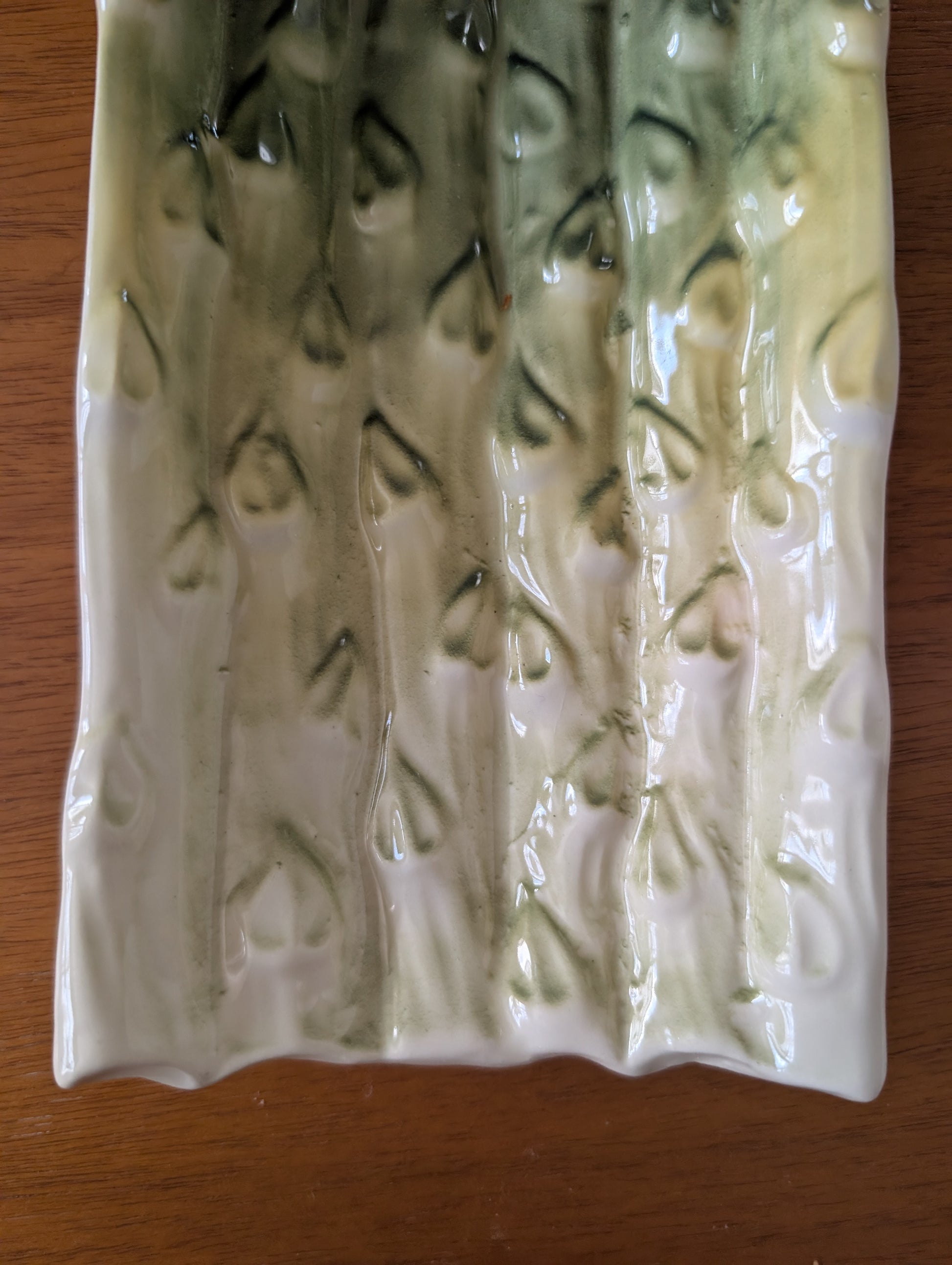 Vintage 1950s Cardinal California Potteries asparagus shaped serving dish. On the back is embossed: The letter "C" within a circle, Cardinal Potteries and made in USA. The asparagus serving dish is in excellent condition with no chip or, cracks.