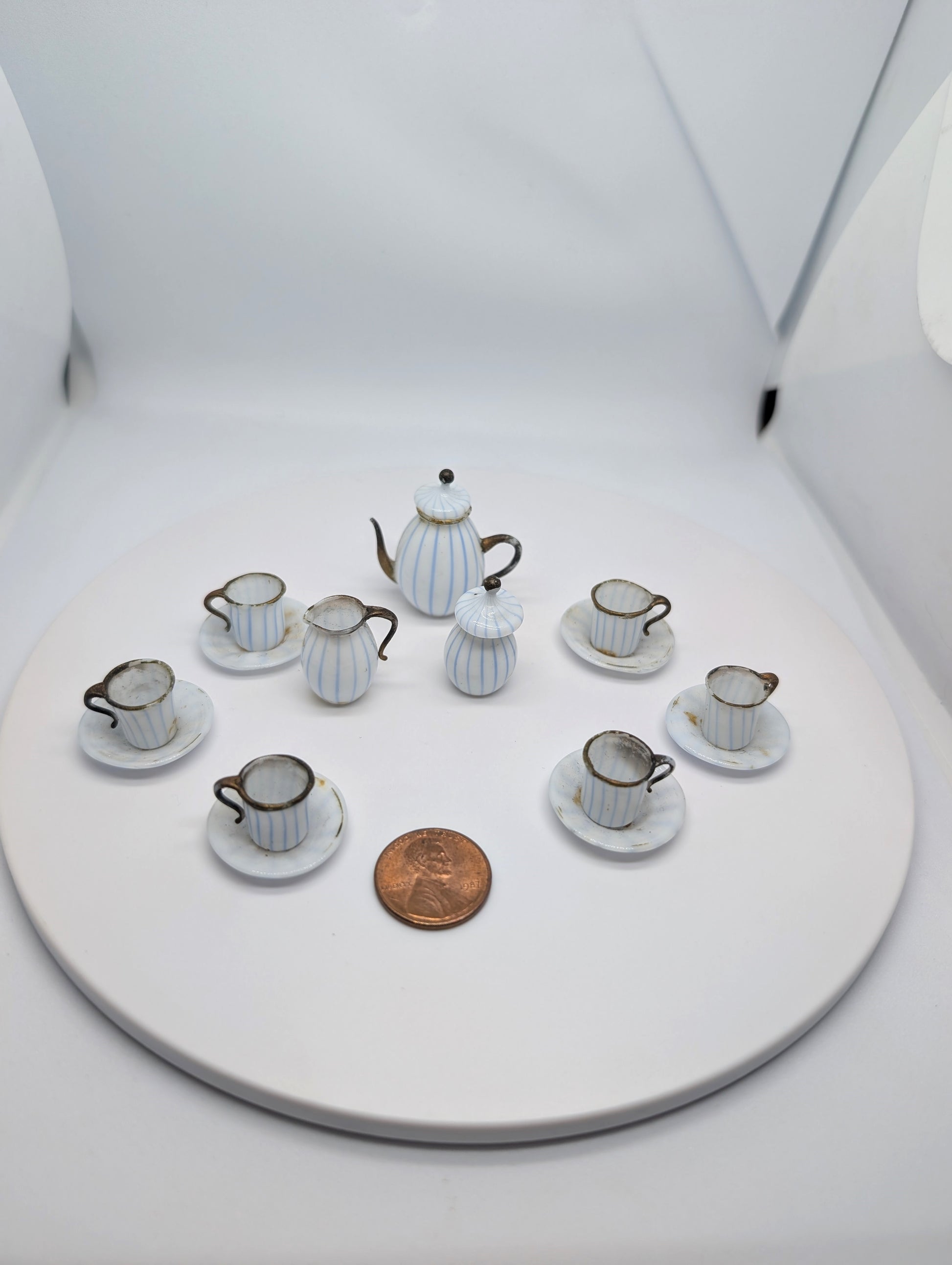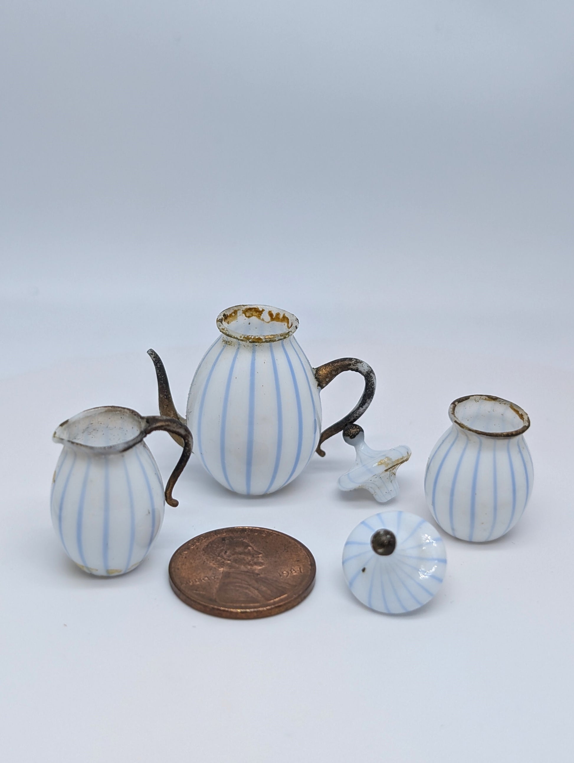 Miniature Blue and White Stripe Glass Coffee Set German 1900 possibly by Lauscha