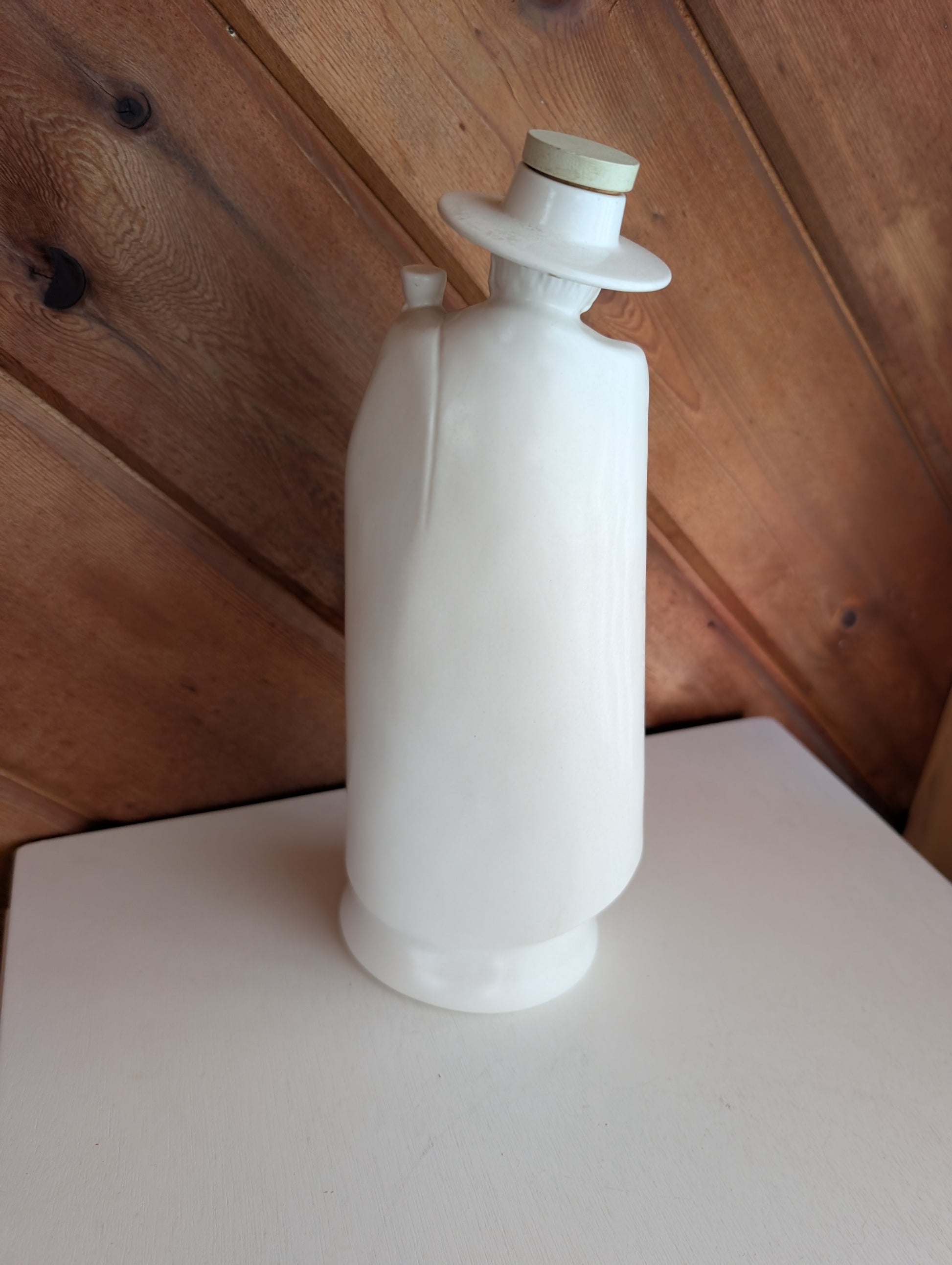 White glass in Right Hand Sandman Armada Cream Sherry decanter by Wedgwood from 1971 with original box. In the shape of Don Juan. Marked on the bottom Wedgwood of Etruria and Barlaston Moonstone