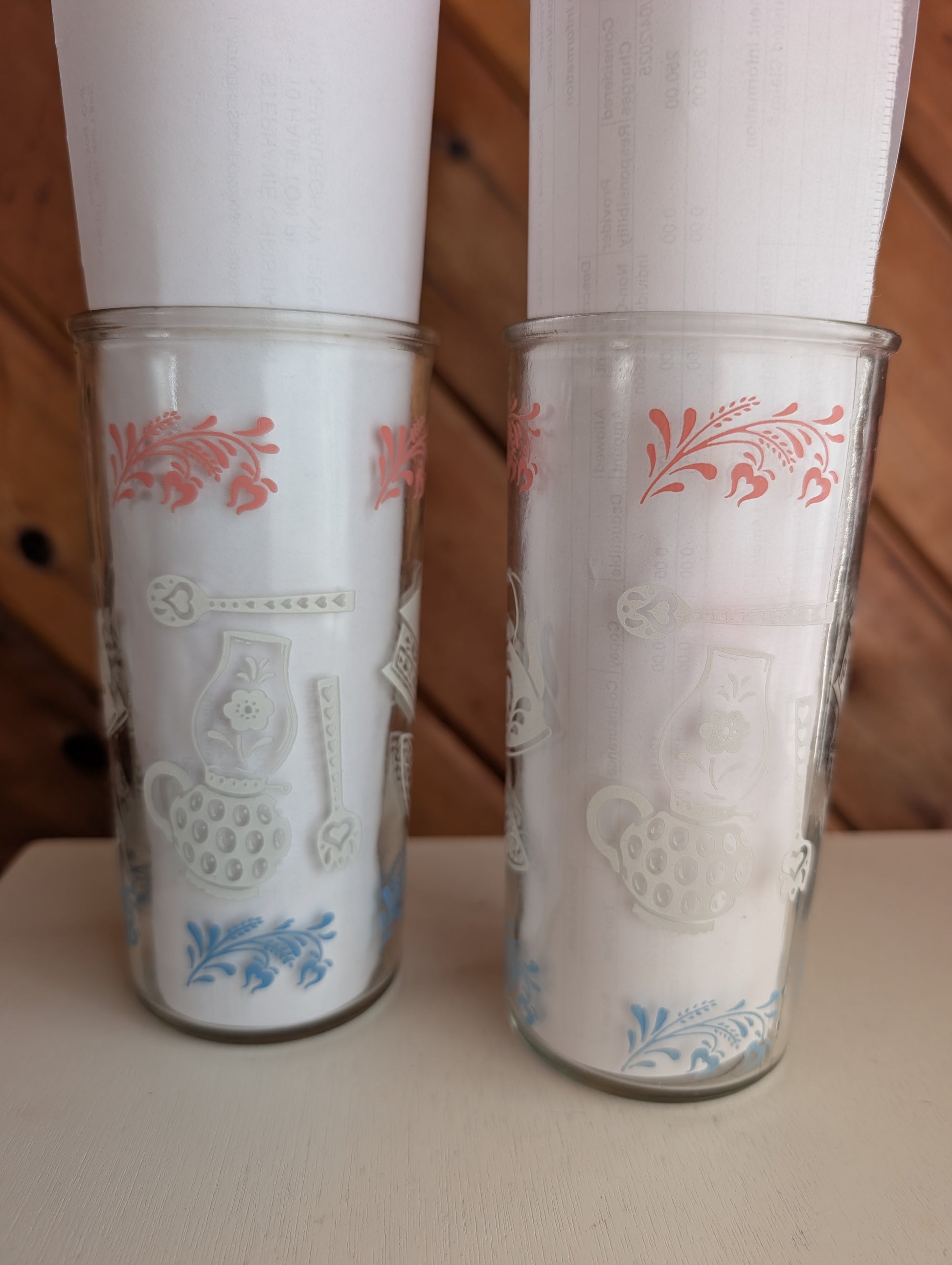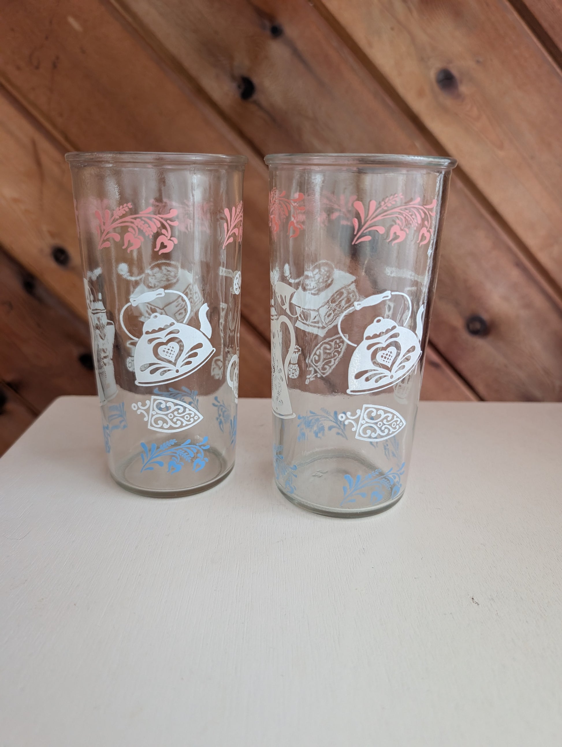 Pair of beautiful Hazel Atlas vintage glasses featuring Kitchen Aides like a coffee grinder, iron, kettle, lantern, tongs and more. Decoration is in pink, blue and white. Glasses would make excellent tumblers or high ball glasses.