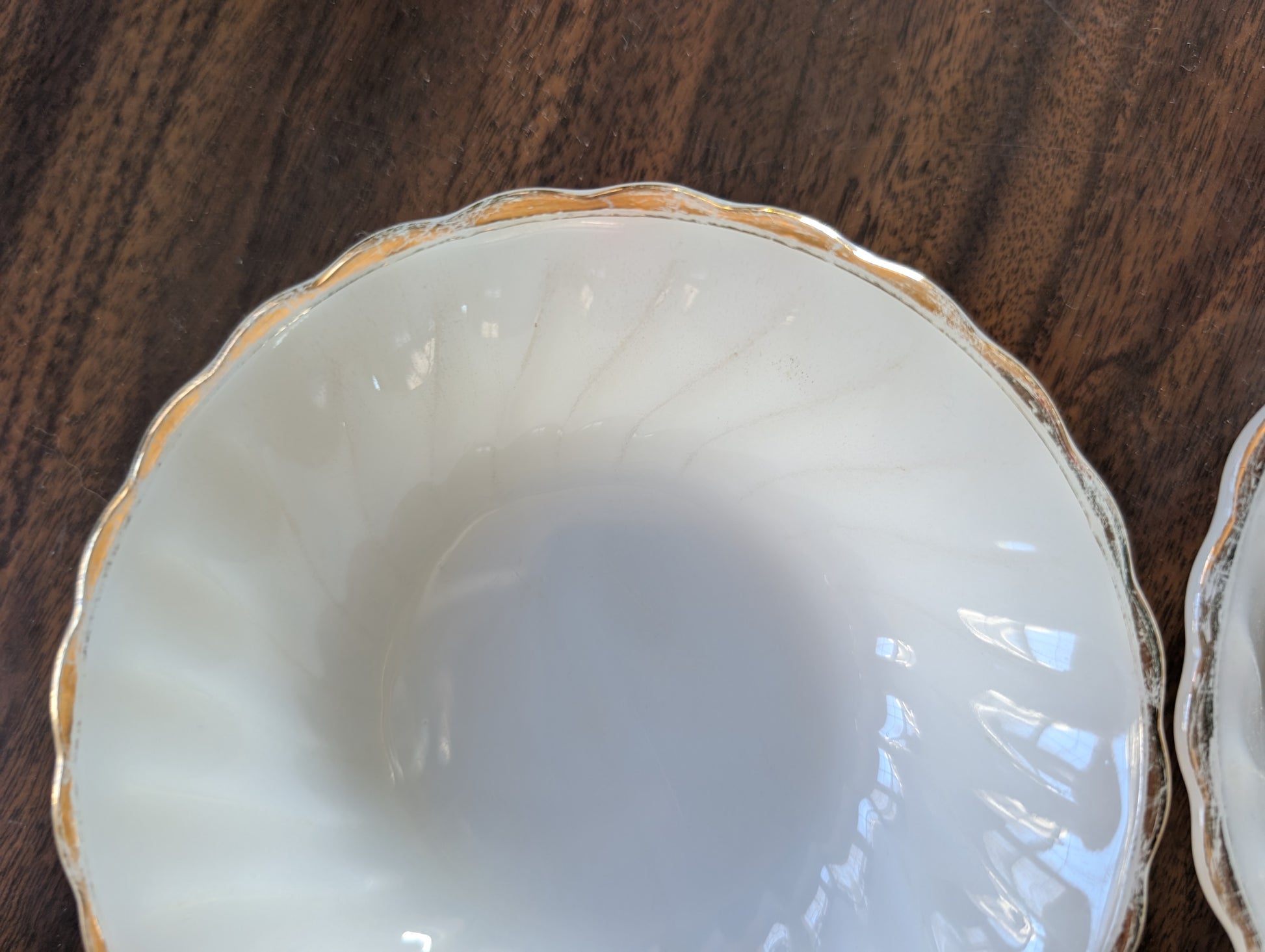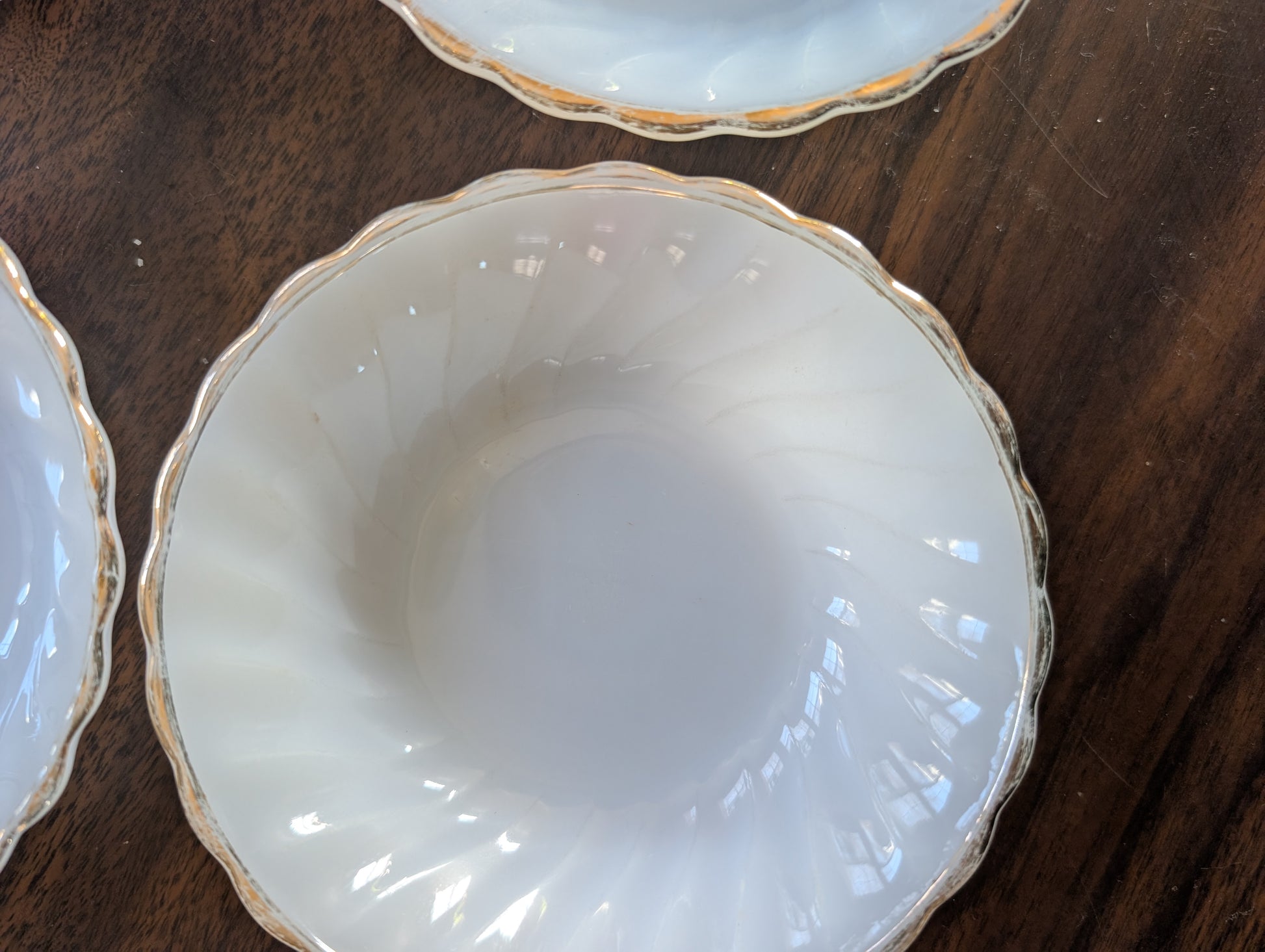 Lot of 4 Anchor Hocking Milk Glass Golden Shell Swirl 5" Fruit/Dessert Bowls Gold Trim.