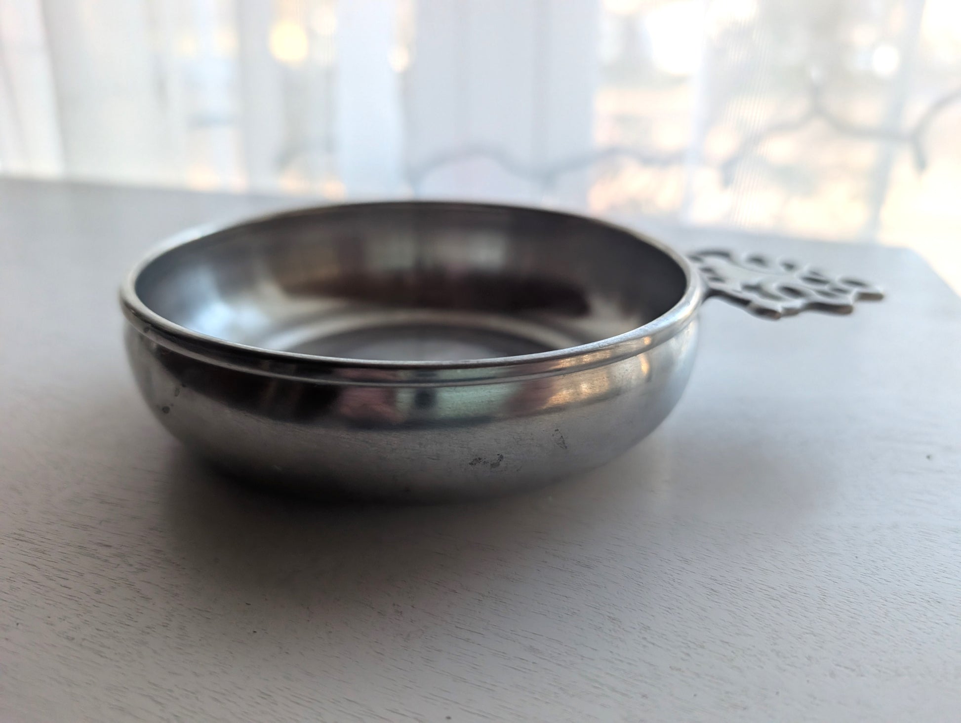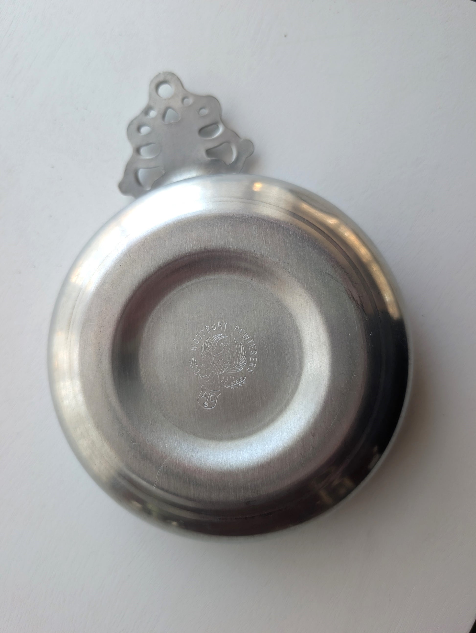 Vintage Woodbury Pewters porringer. Bowl diameter is 5". A porringer is a shallow bowl with a handle for foods like porridge or soup. Woodbury Pewter manufactures fine items out of Connecticut. Pewter is 92% Tin, 6% Antimony and 2% Copper (No Lead). Good vintage condition with one dent (pictured)