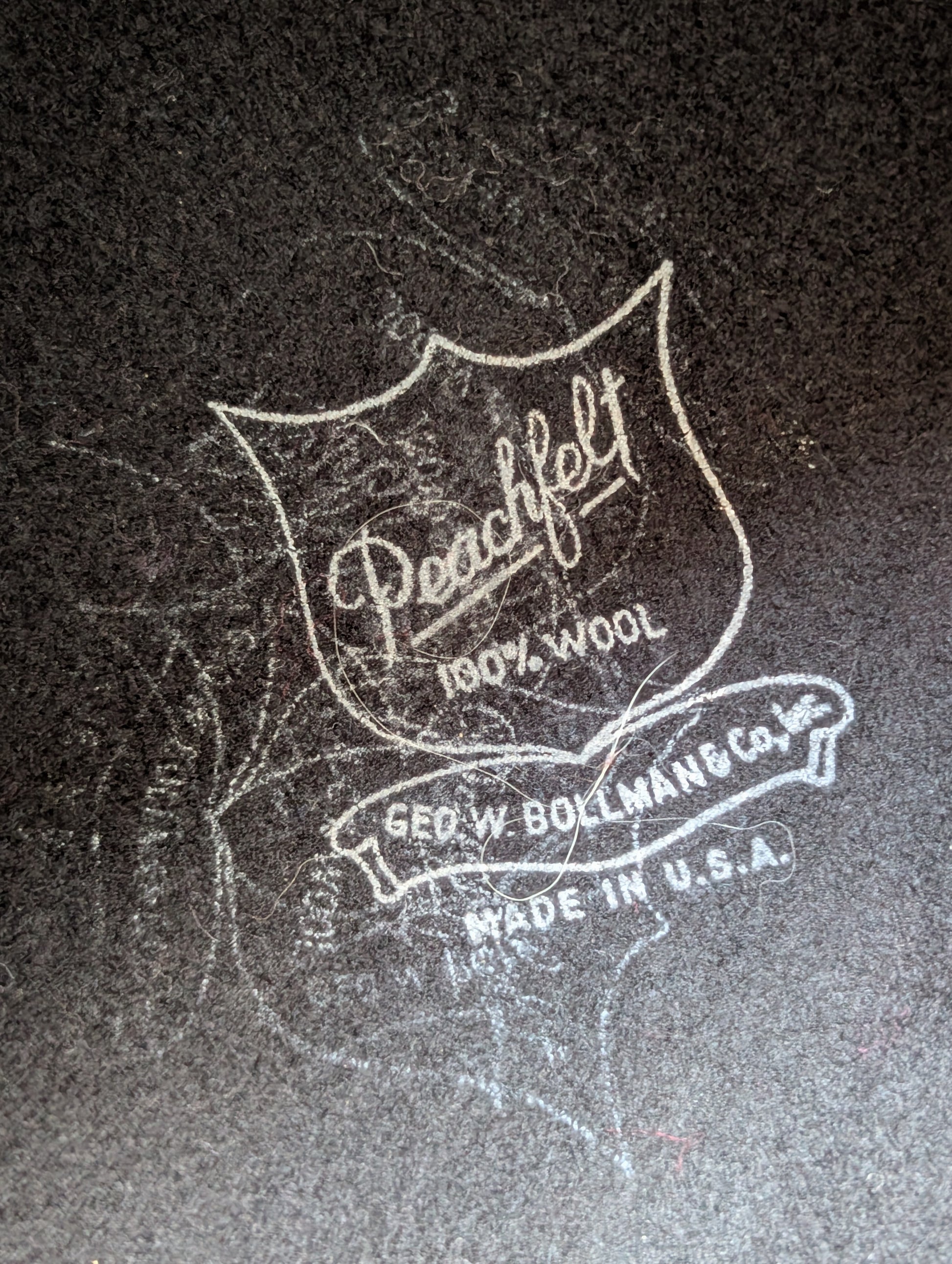Great vintage Geo. W. Bollman Peachfelt hat in Black. Originally sold at Lord & Taylor. Scarf ties may have been added at a later date, it is hard to tell. Shipping in a Wilby Custom Hatter box which is not original to the hat. Box is great for décor or storage.