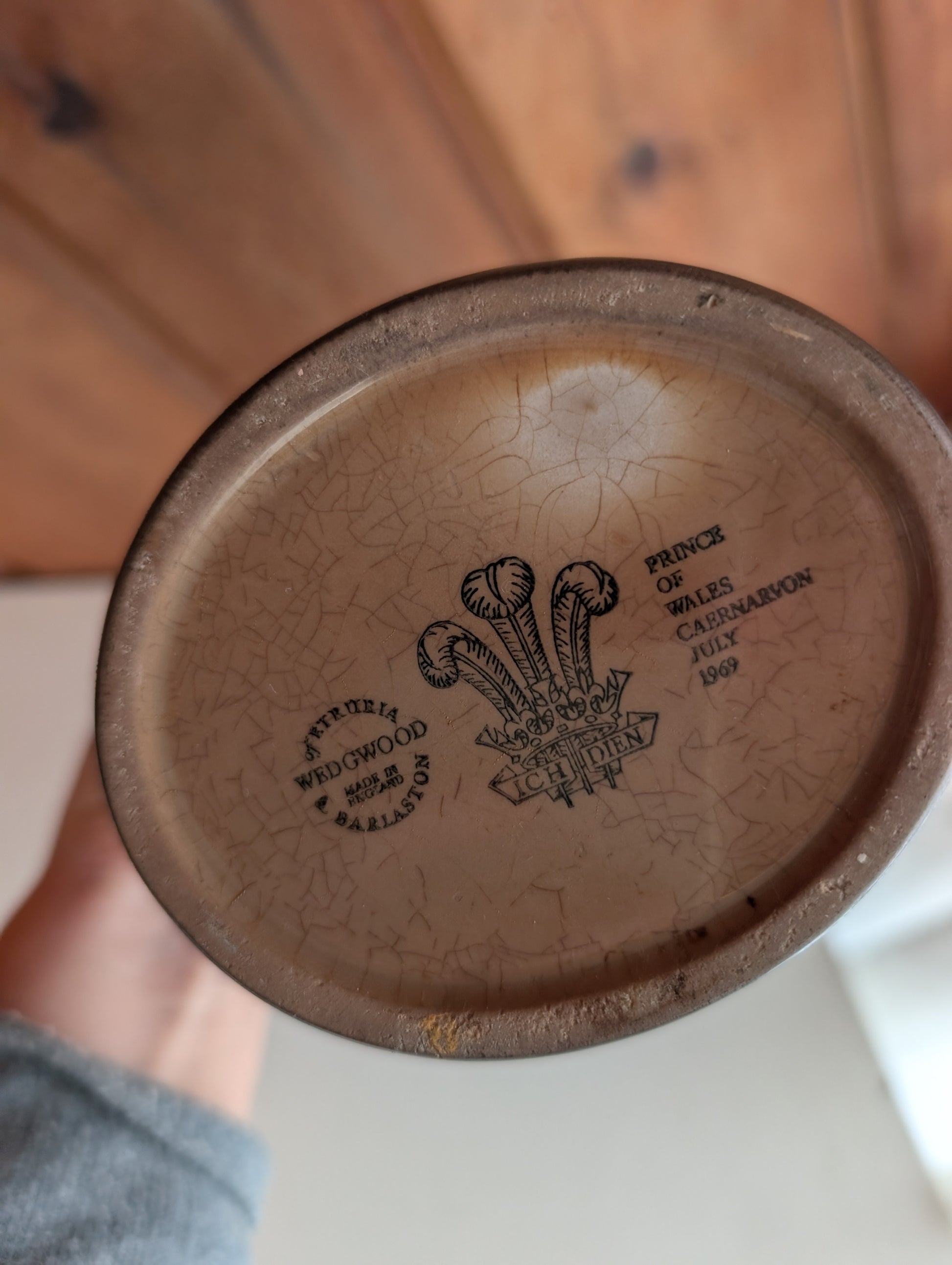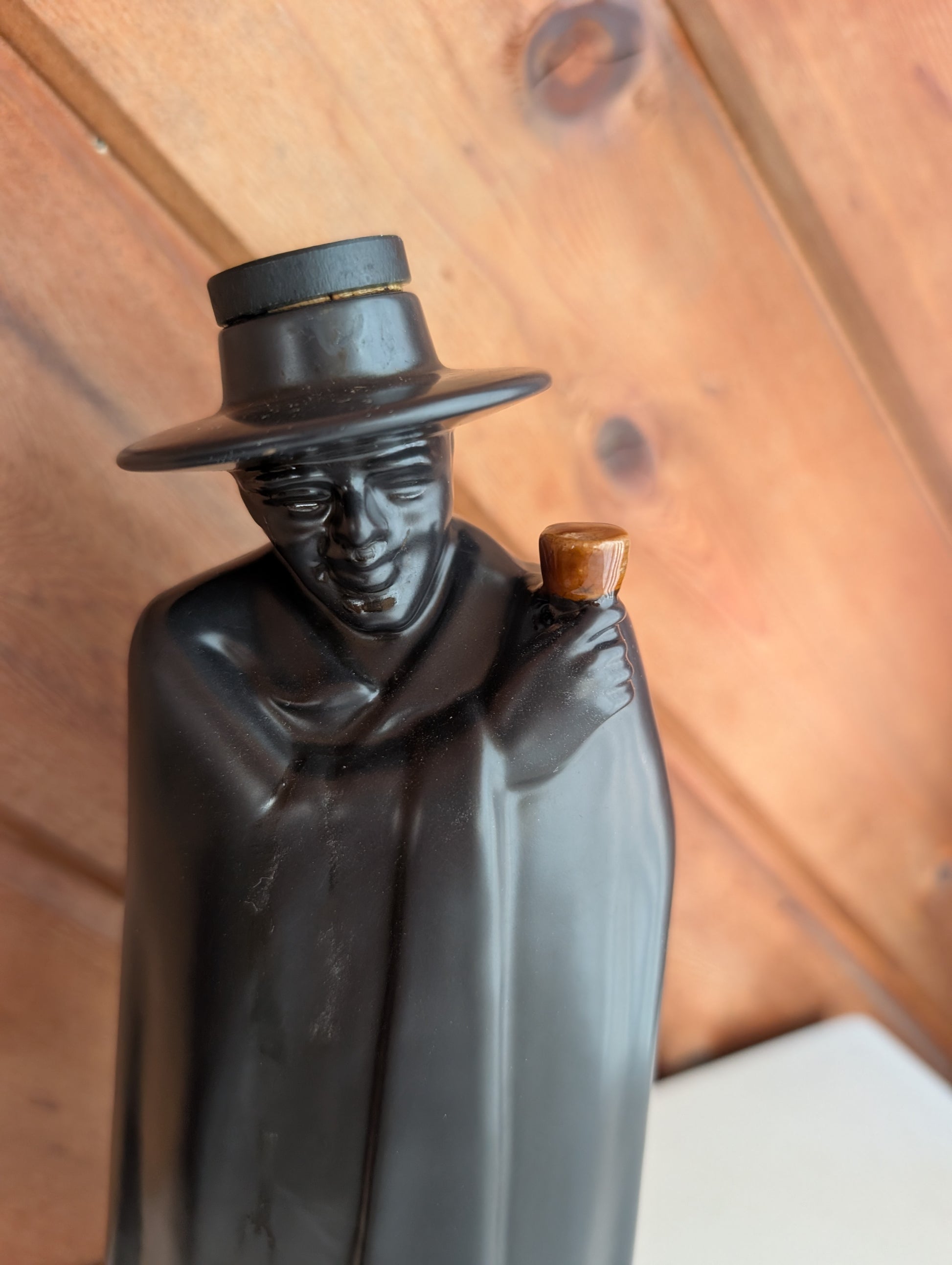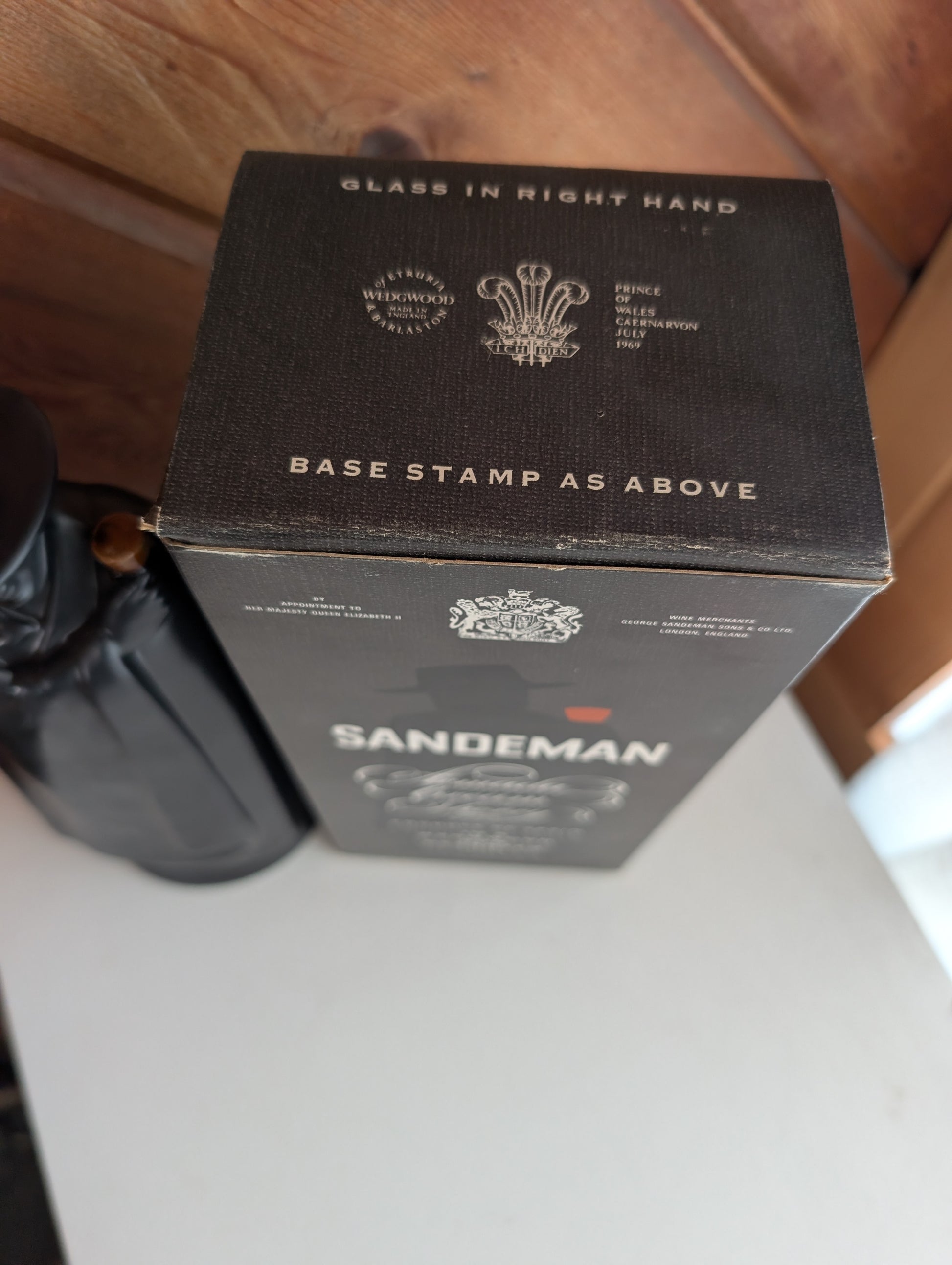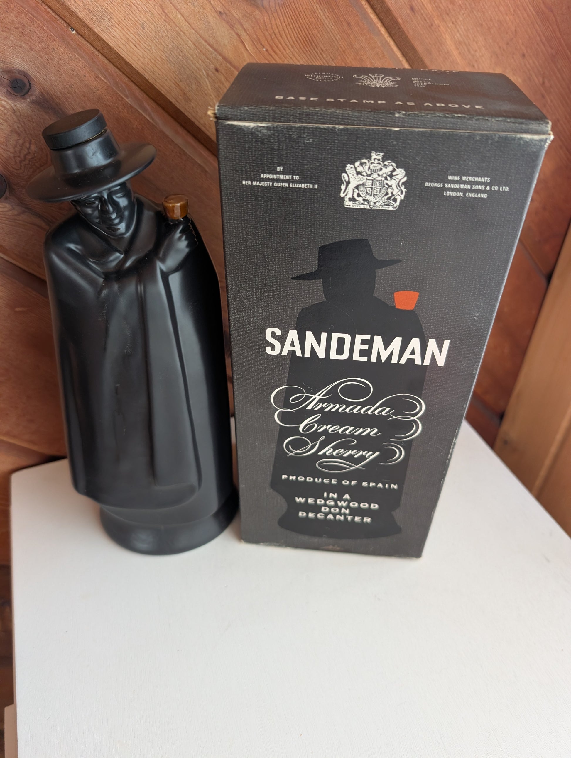 Glass in Right Hand Sandman Armada Cream Sherry decanter by Wedgwood from 1969 with original box. In the shape of Don Juan. Marked on the bottom Wedgwood of Etruria and Barlaston. Made in England. Prince of Wales Caernarvon July 1969. Box is stained with old Sherry